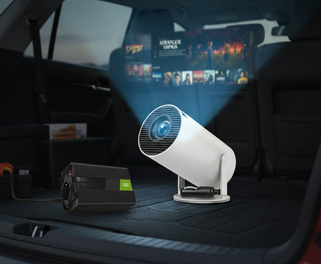 Przenośny projektor do oglądania filmów, seriali i grania w domu, ogrodzie, na działce lub prosto z samochodu. W kilka minut tworzysz kino gdziekolwiek jesteś — bez gniazdka, bez skomplikowanej instalacji.